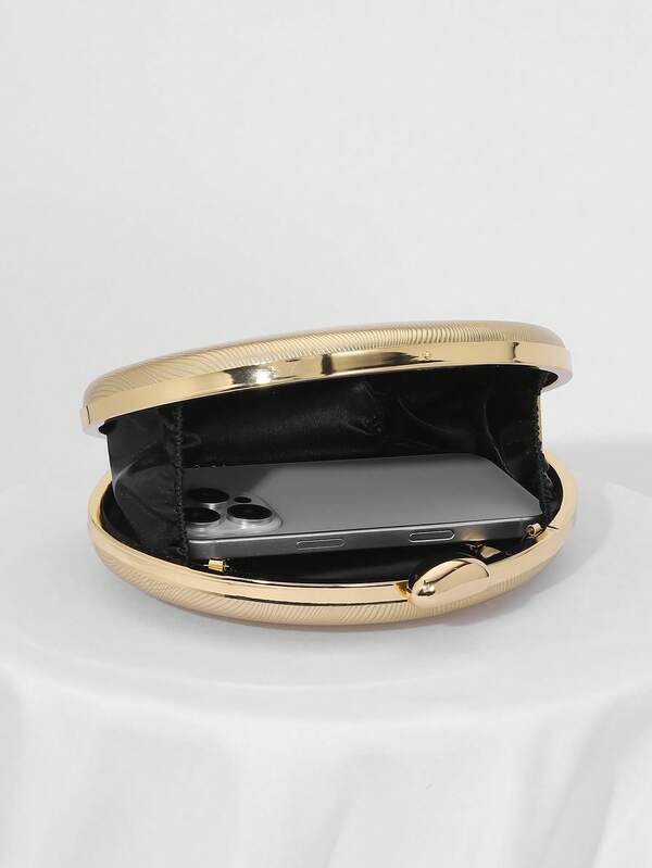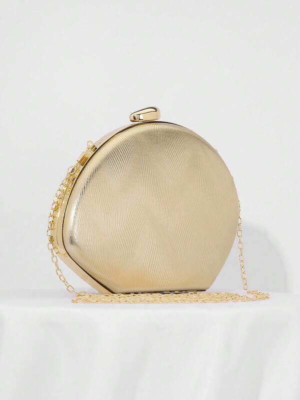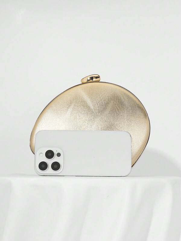 A bold celebration of modern luxury, the Golden Eclipse Clutch draws the eye with its sculptural round silhouette and wave-textured metallic finish. Minimal yet striking, it is a radiant companion for soirées, designed to frame your presence with golden light.