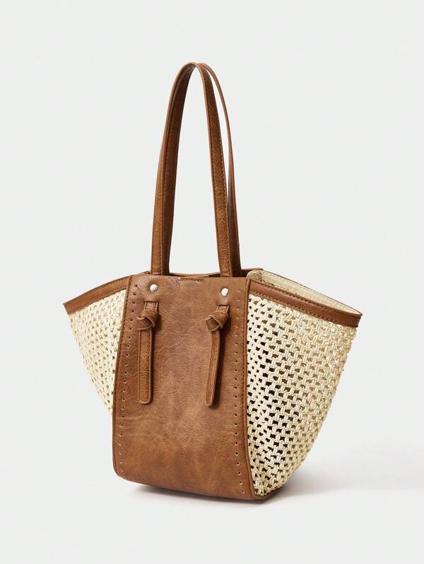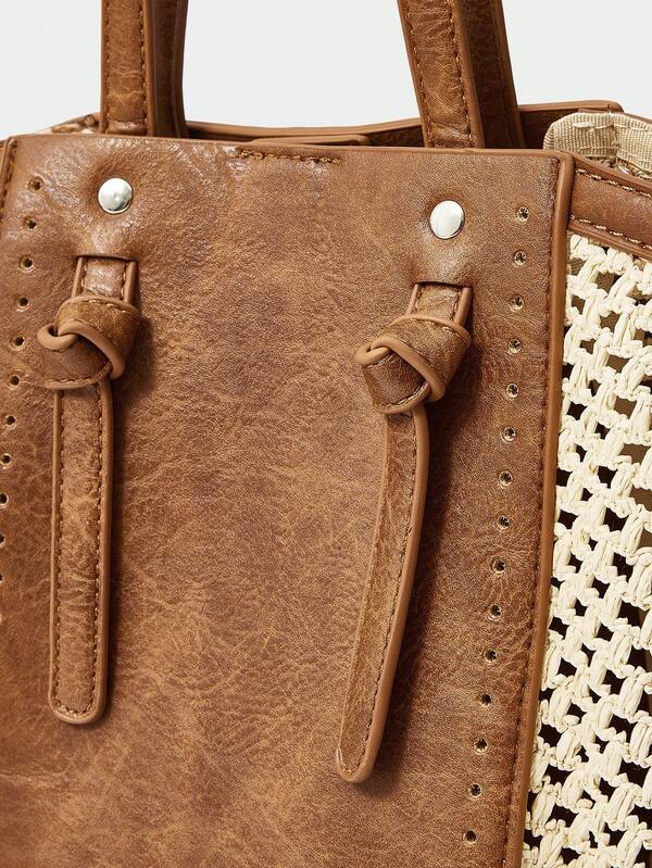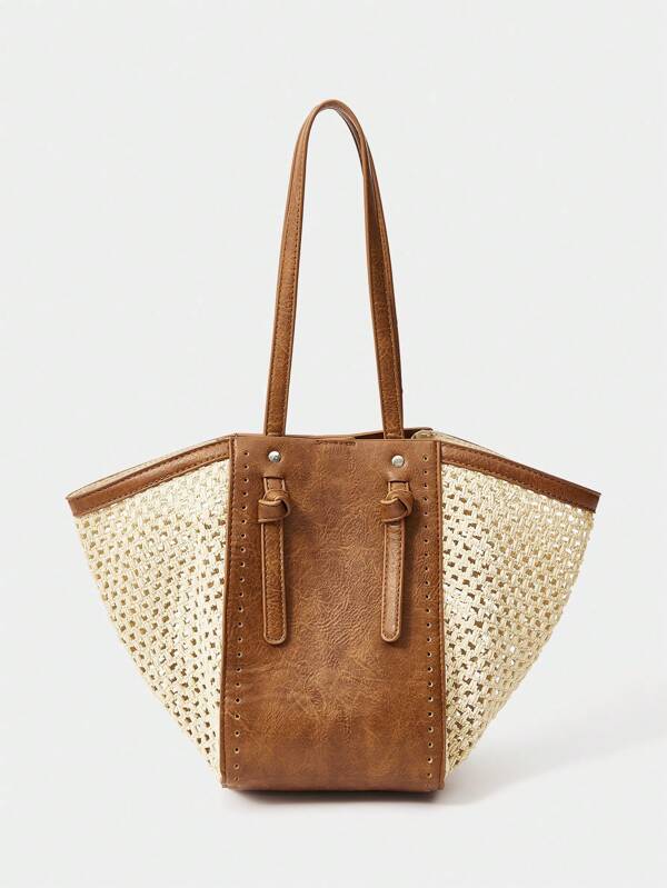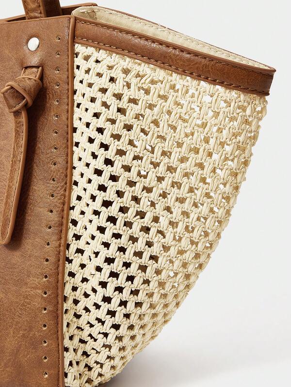 This tote blends tradition and modernity with handwoven raffia panels framed by smooth faux leather. The structured shape and earthy tones create a versatile piece that carries the essence of craftsmanship and timeless style.